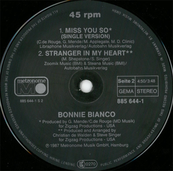Bonnie Bianco – Miss You So (12″, Maxi)