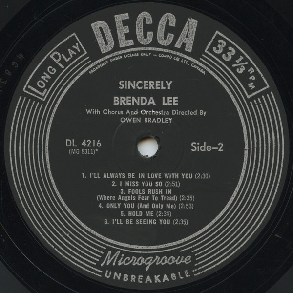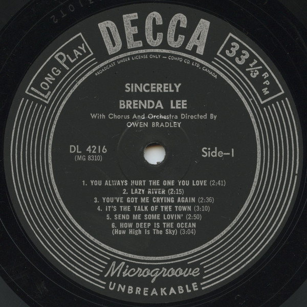 Brenda Lee – Sincerely (LP, Album, Mono)