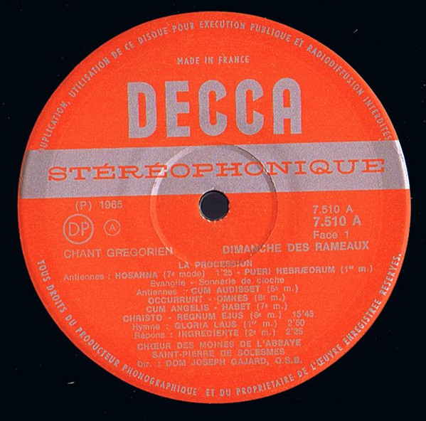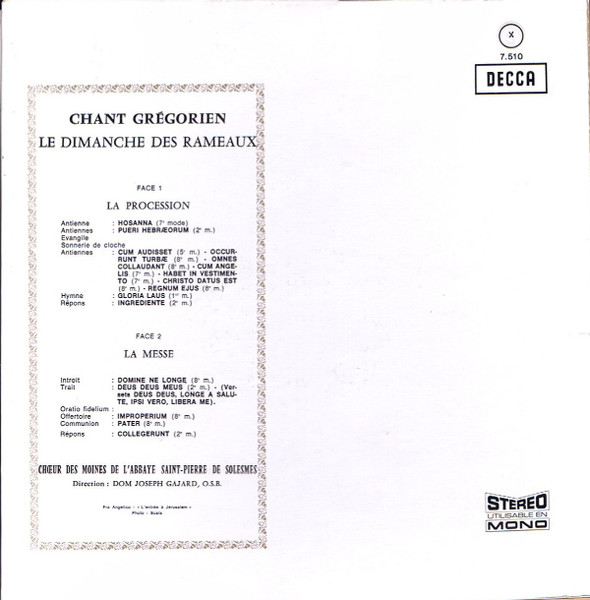 Chœur Des Moines De L’Abbaye Saint-Pierre De Solesmes, Dom Joseph Gajard – Chant Grégorien – Le Dimanche Des Rameaux (LP, RE, Gat)