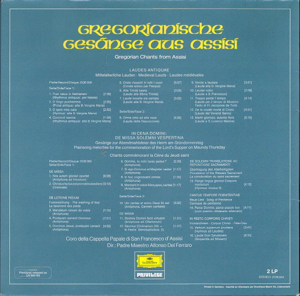 Coro Della Cappella Papale Di San Francesco D’Assisi*, Padre Maestro Alfonso Del Ferraro* – Gregorianische Gesänge Aus Assisi = Gregorian Chants From Assisi (2xLP, RE, Gat)