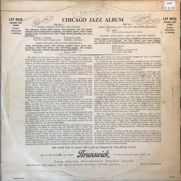 Eddie Condon And His Chicagoans, Jimmy McPartland And His Orchestra, George Wettling’s Chicago Rhythm Kings – Chicago Jazz (LP, Comp, Mono)