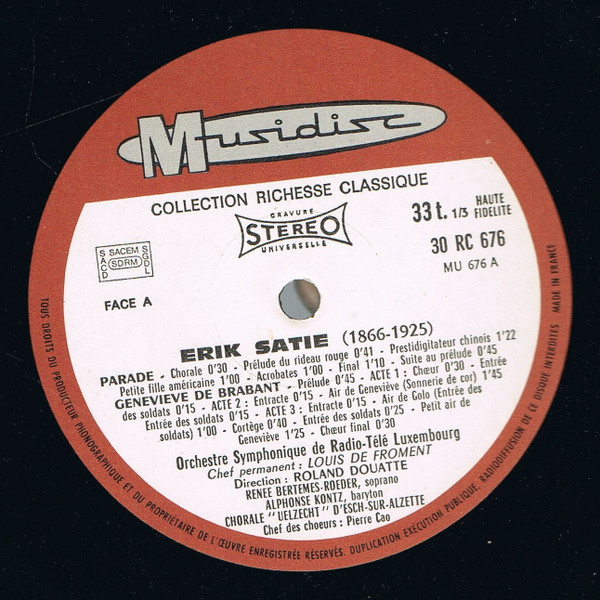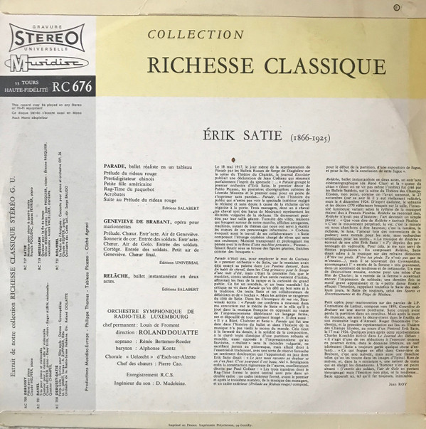 Erik Satie, Orchestre Symphonique De Radio-Télé Luxembourg* Direction Roland Douatte – Parade / Geneviève De Brabant / Relâche (LP, RE, Fli)