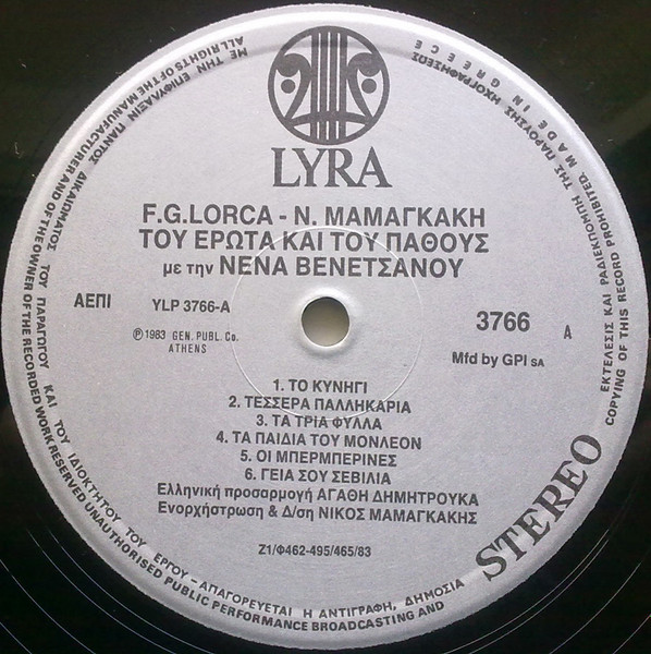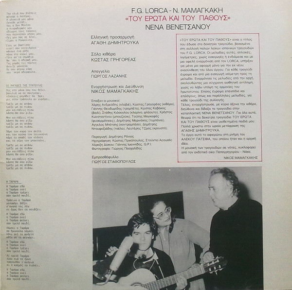 Federico García Lorca – Nikos Mamangakis, Νένα Βενετσάνου , Ελληνική Προσαρμογή Αγαθή Δημητρούκα – Του Έρωτα Και Του Πάθους (LP, Album)