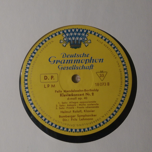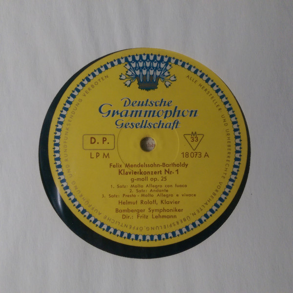 Felix Mendelssohn-Bartholdy – Helmut Roloff, Bamberger Symphoniker, Fritz Lehmann – Konzerte Für Klavier Und Orchester Nr. 1 G-moll Op. 25 / Konzert Für Klavier Und Orchester Nr. 2 D-moll Op. 40 (LP, Mono)