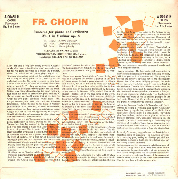 Frédéric Chopin By Alexander Uninsky, Residentie Orkest, Willem van Otterloo – Concerto For Piano And Orchestra No. 1 (10″)