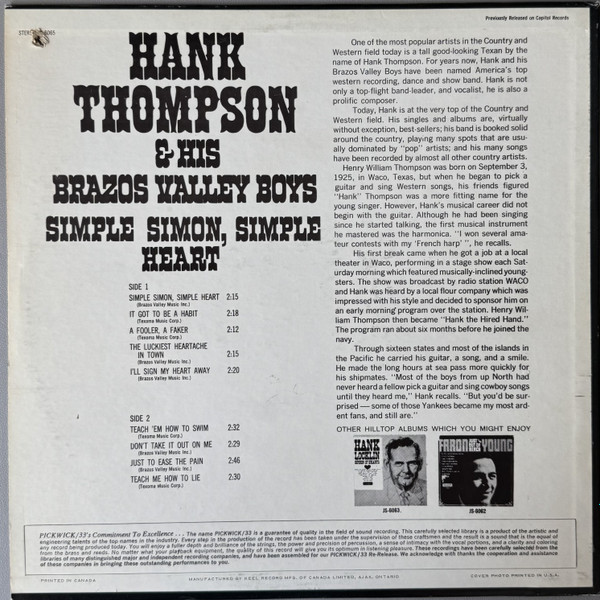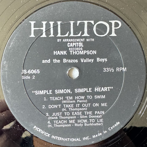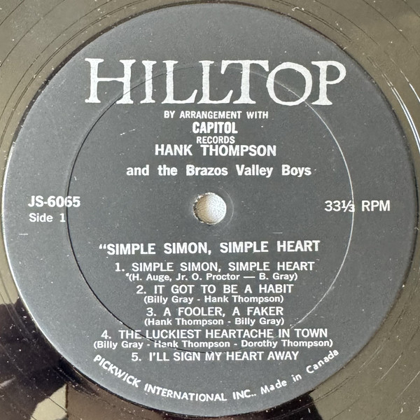 Hank Thompson And His Brazos Valley Boys – Simple Simon, Simple Heart (LP, Album, RE)