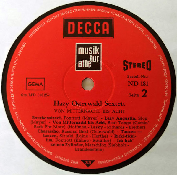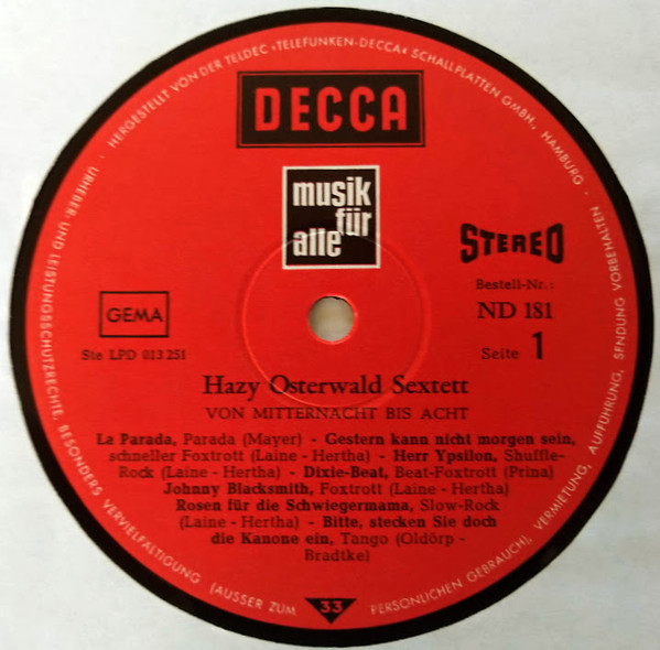 Hazy Osterwald Sextett – Von Mitternacht Bis Acht (LP, Album)