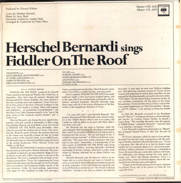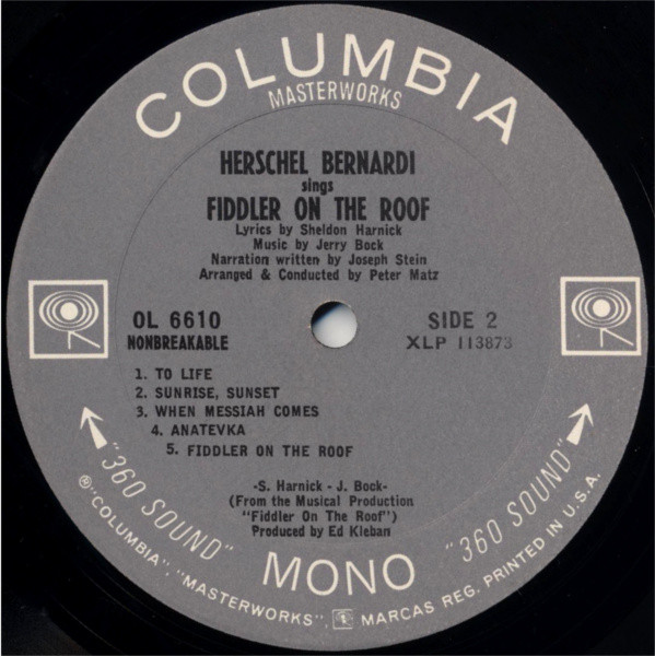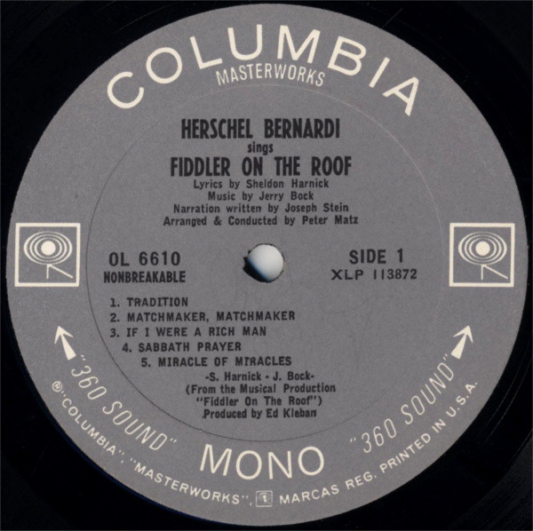 Herschel Bernardi – Herschel Bernardi Sings Fiddler On The Roof (LP, Album, Mono)