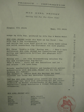 His Girl Friday – Having Sex For The First Time / That’s Hate (12″, Maxi)