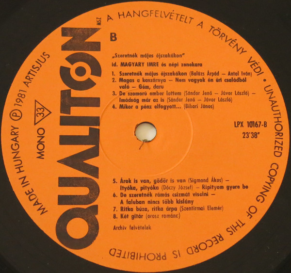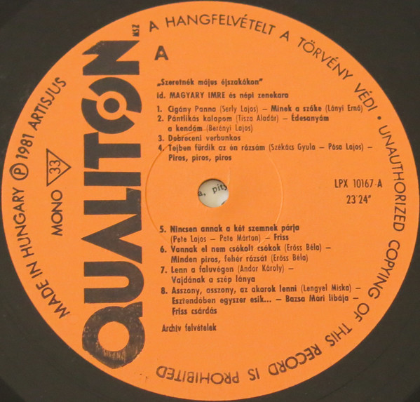 Imre Magyari And His Gypsy Orchestra – Szeretnék Május Éjszakákon… (LP, Album, Mono)