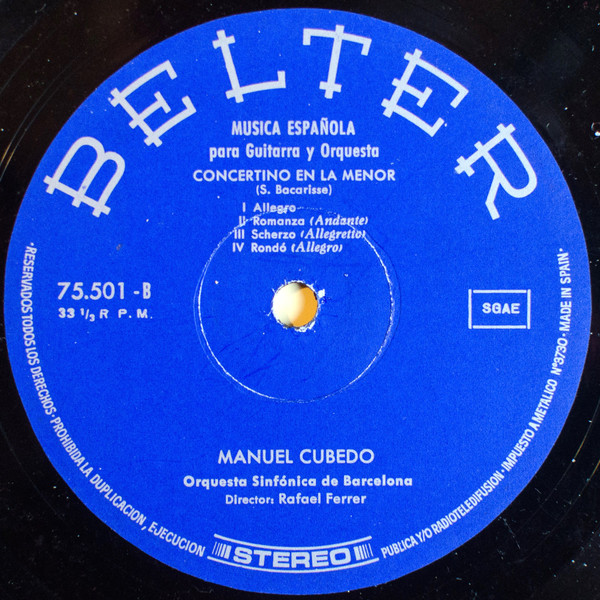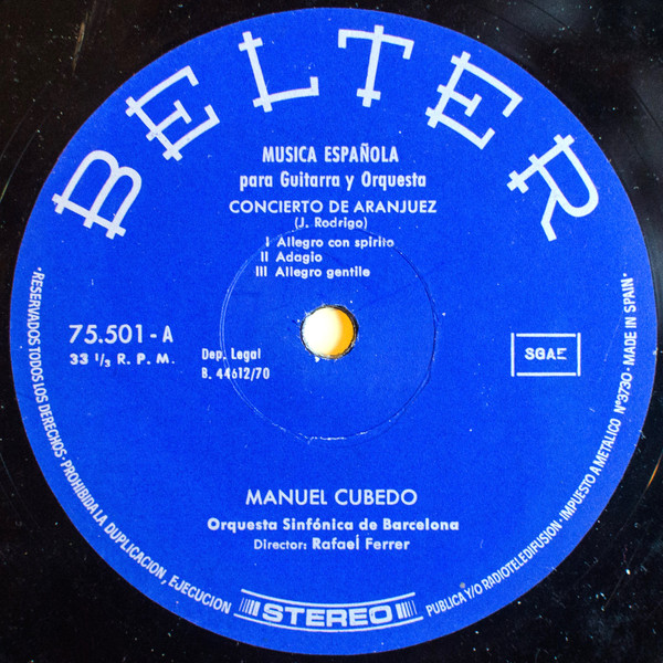 Joaquín Rodrigo, Salvador Bacarisse – Manuel Cubedo, Orquestra Simfónica De Barcelona , Director: Rafael Ferrer – Musica Española Para Guitarra Y Orquesta (Concierto De Aranjuez / Concertino En La Menor) (LP, Album)