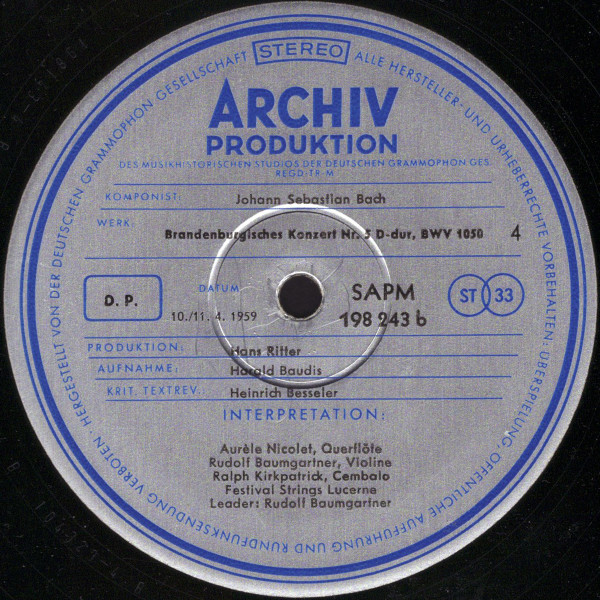 Johann Sebastian Bach – Adolf Scherbaum – Aurèle Nicolet – Rudolf Baumgartner – Hans-Martin Linde – Helmut Winschermann – Ralph Kirkpatrick – Festival Strings Lucerne – Brandenburgische Konzerte Nr. 2 F-dur BWV 1047, Nr. 3 G-dur BWV 1048, Nr. 5 D-dur BWV 1050 (LP, Tri)