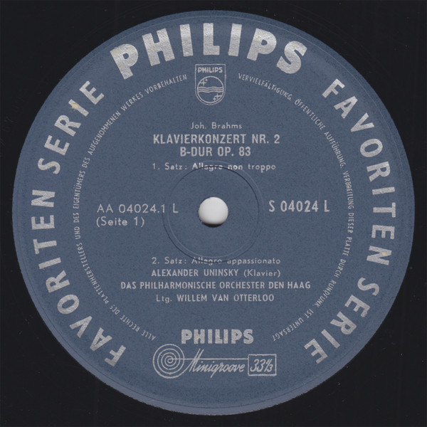 Johannes Brahms – Alexander Uninsky, Willem Van Otterloo Leitet The Hague Philharmonic – Klavierkonzert Nr. 2 (LP, Album, Mono)
