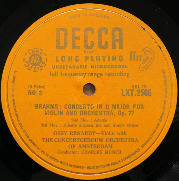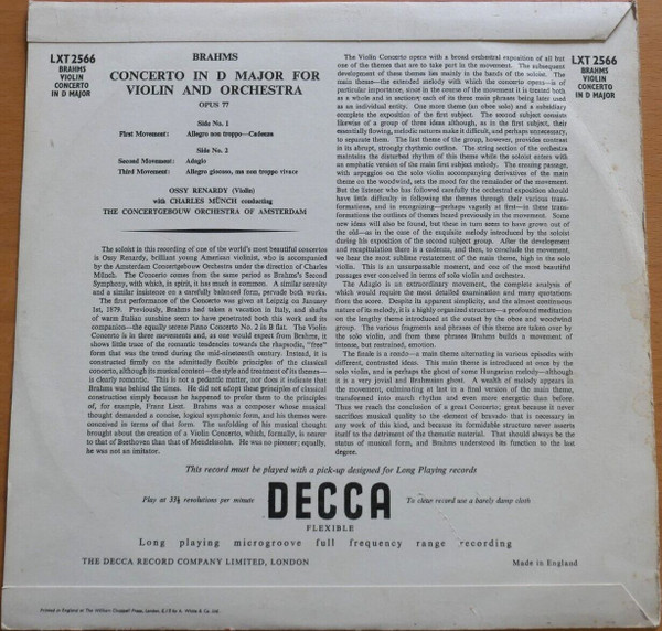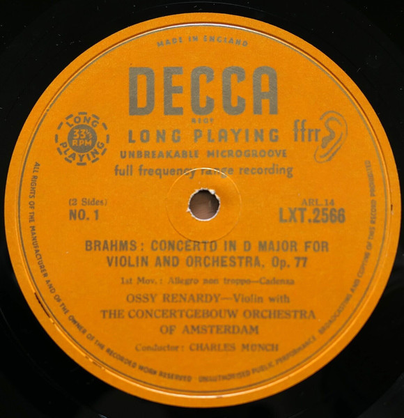 Johannes Brahms, Ossy Renardy With Charles Munch Conducting The Concertgebouworkest – Concerto In D Major For Violin And Orchestra (LP, Album, Mono)