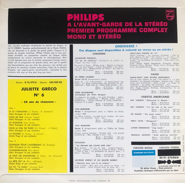 Juliette Gréco – N°6 – 10 Ans De Chansons (10″, Album, Mono)