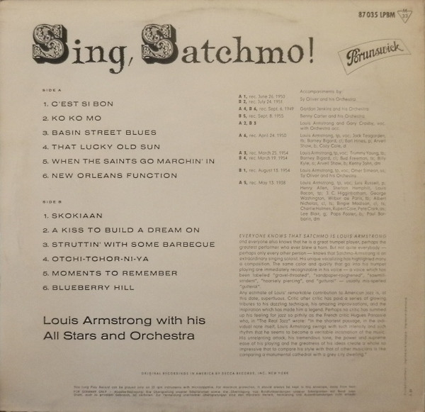 Louis Armstrong With His All Stars* And Orchestra* – Sing, Satchmo! (LP, Comp, Mono, RE)
