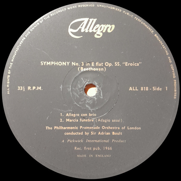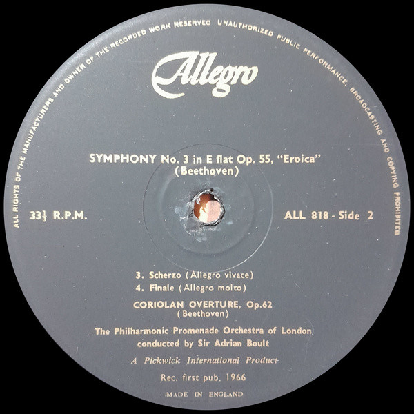 Ludwig Van Beethoven – Sir Adrian Boult, The Philharmonic Promenade Orchestra – Symphony No. 3 In E Flat Major, Op. 55 ‘Eroica’ / Coriolan Overture, Op. 62 (LP, Mono, RE)