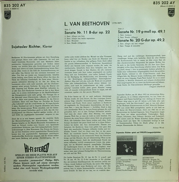 Ludwig van Beethoven, Sviatoslav Richter – Klaviersonaten Nr. 11 B-dur Op. 22 – Nr. 19 G-moll Op. 49, 1 – Nr. 20 G-dur Op. 49, 2 (LP)