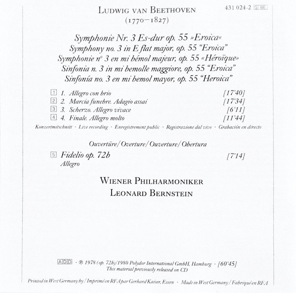 Ludwig van Beethoven, Wiener Philharmoniker, Leonard Bernstein – Symphonie No. 3 »Eroica« – Ouvertüre »Fidelio« (CD, Album, RM)