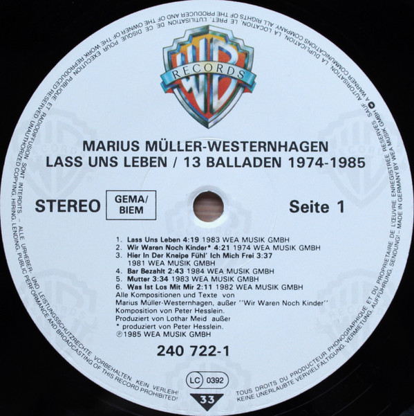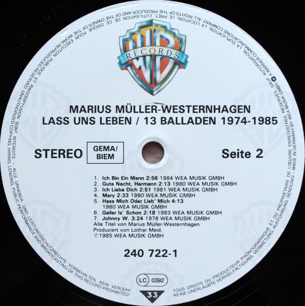 Marius Müller-Westernhagen – Lass Uns Leben / 13 Balladen 1974-1985 (LP, Comp)