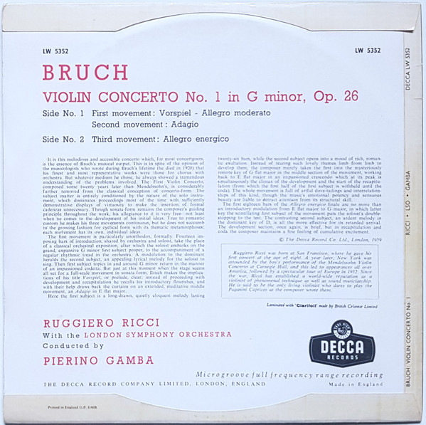 Max Bruch – Ruggiero Ricci, London Symphony Orchestra, Pierino Gamba – Violin Concerto No. 1 (10″, Album)