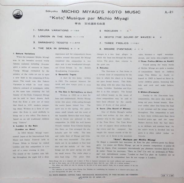 Michio Miyagi = Michio Miyagi – Sôkyoku – Michio Miyagi’s Koto Music = “Koto” Musique Par Michio Miyagi = 筝曲 宮城道雄名曲選 (LP, Album, RE)