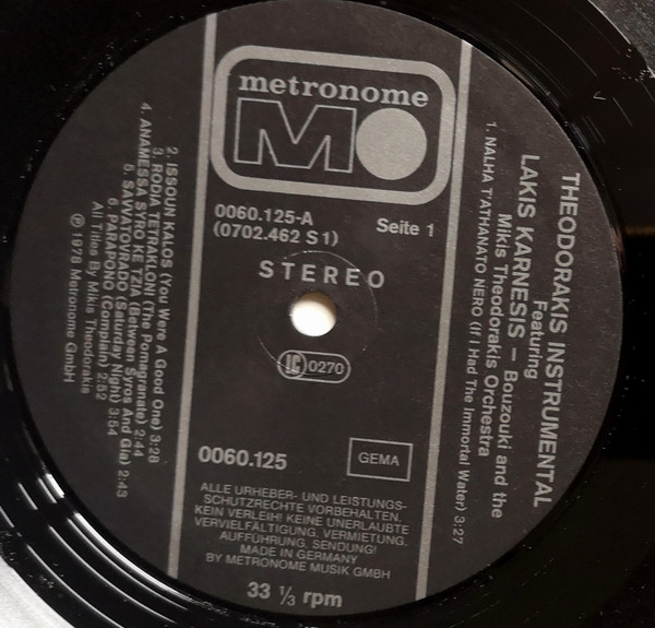 Mikis Theodorakis Feauturing Lakis Karnesis* -Bouzouki & The Mikis Theodorakis Orchestra* – Instrumental (LP, Comp)