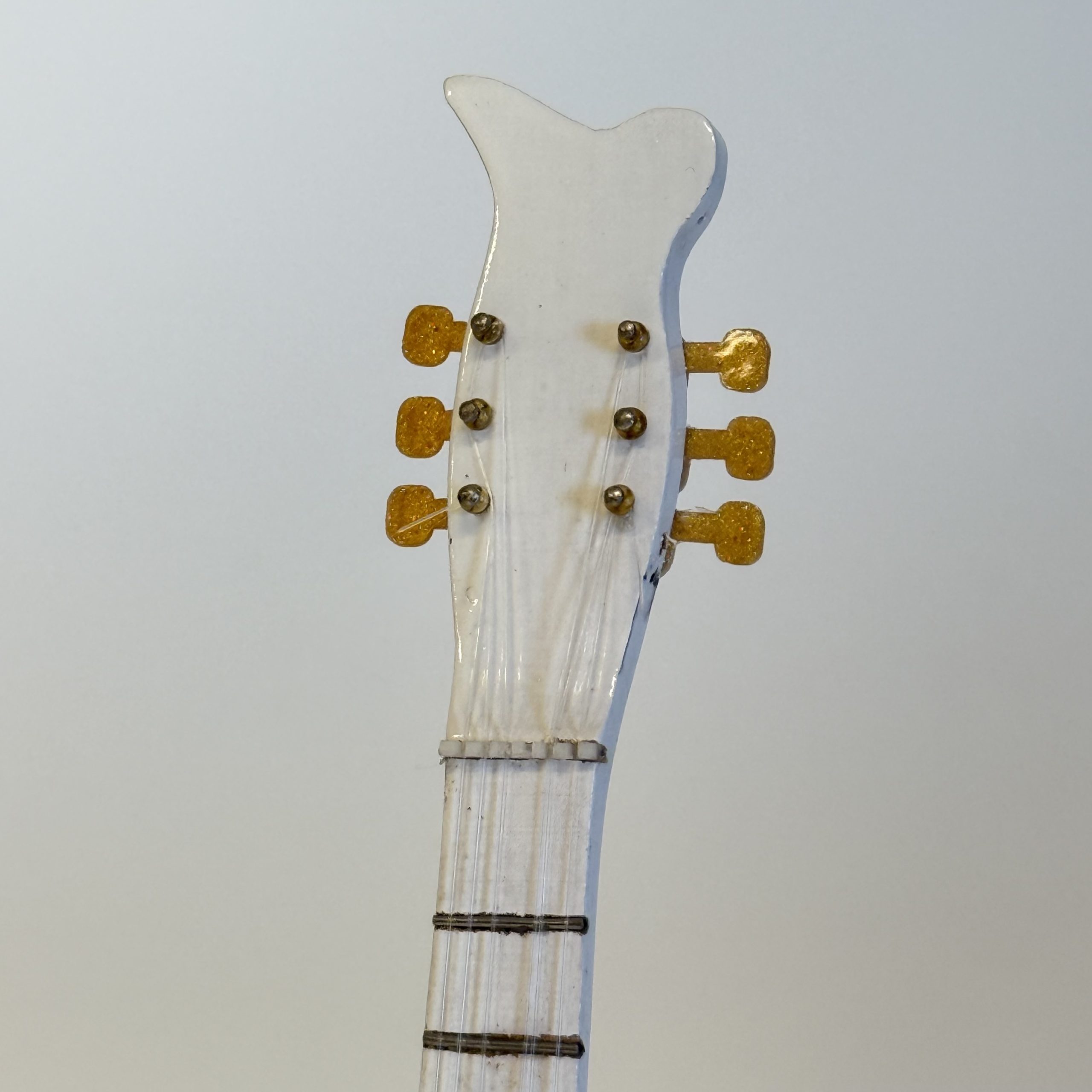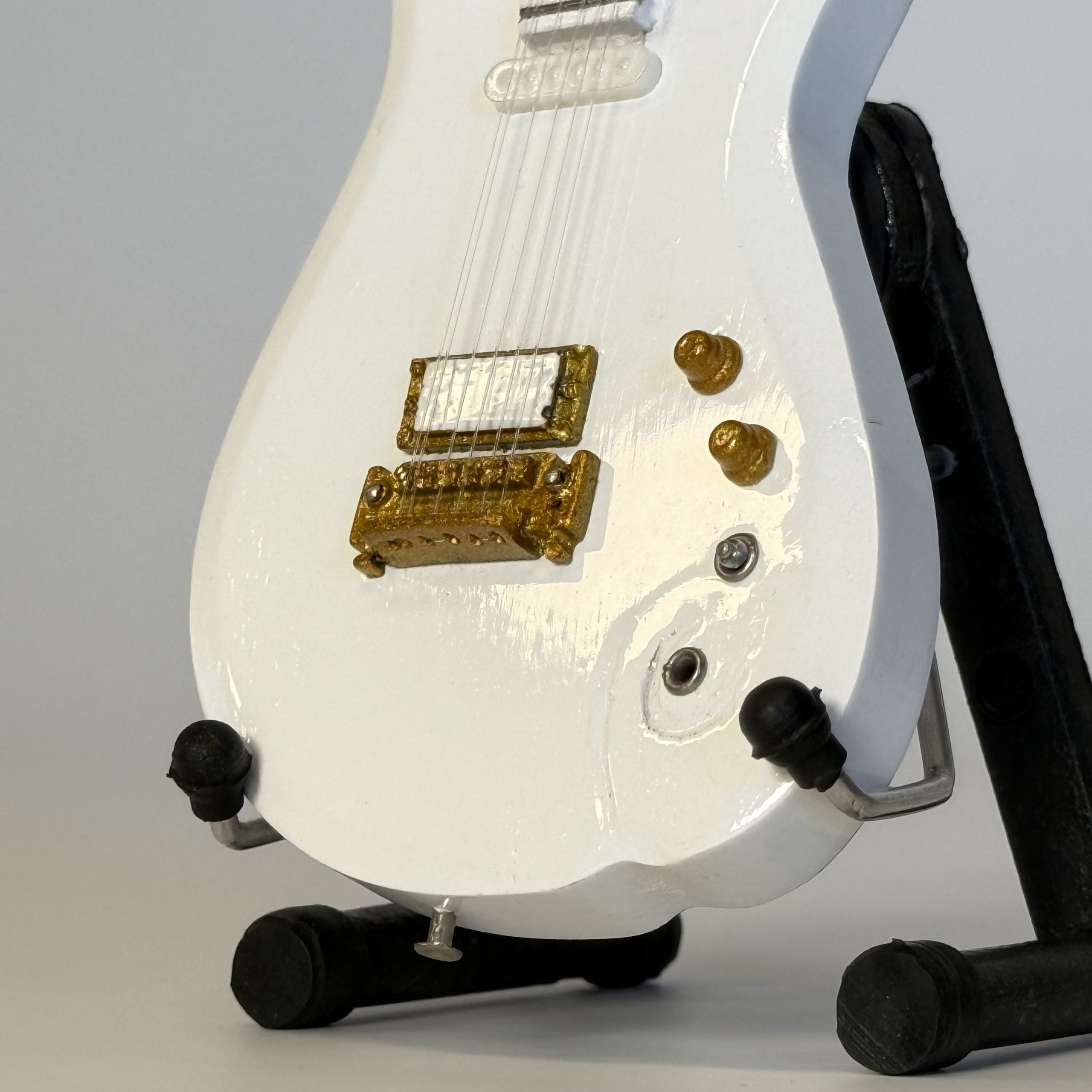Deze miniatuur gitaar is met de hand geschilderd en geïnspireerd op het iconische model van Prince – Cloud guitar. Door het lichte materiaal en het ambachtelijke schilderproces kan het voorkomen dat er een klein krasje of een subtiele imperfectie zichtbaar is. Dit is niet altijd het geval en doet absoluut niets af aan het geheel. Integendeel zelfs, het maakt elk exemplaar uniek en versterkt de authentieke uitstraling van dit bijzondere verzamelobject.