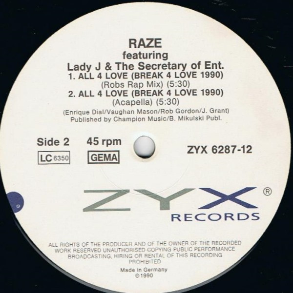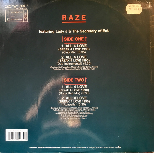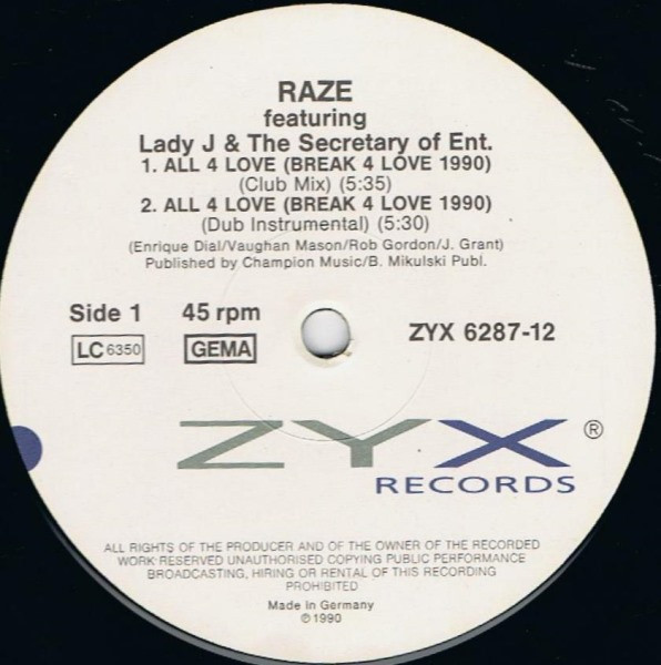 Raze Featuring Lady J & The Secretary Of Ent.* – All 4 Love (Break 4 Love 1990) (12″)