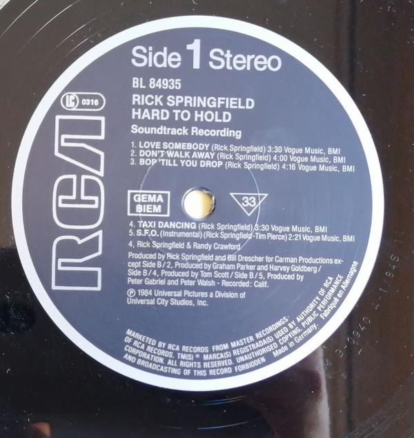 Rick Springfield – Hard To Hold – Soundtrack Recording (LP, Album)