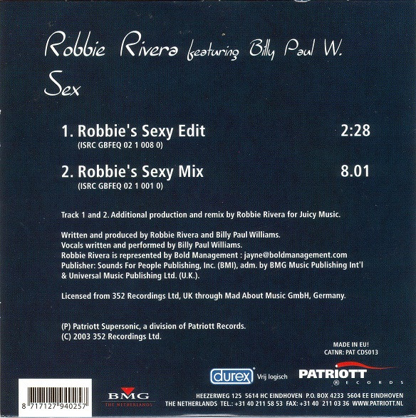 Robbie Rivera featuring Billy Paul Williams – Sex (CD, Single, Car)