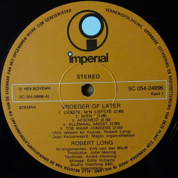 Robert Long – Vroeger Of Later (LP, Album, Ora)