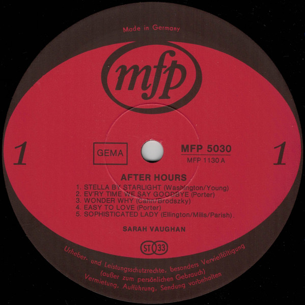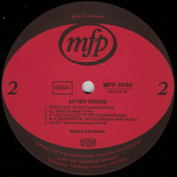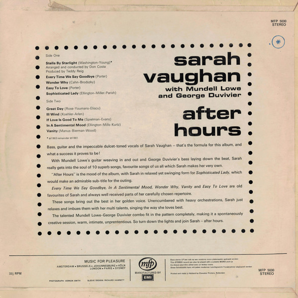 Sarah Vaughan With Mundell Lowe And George Duvivier – After Hours (LP, Album, RE)