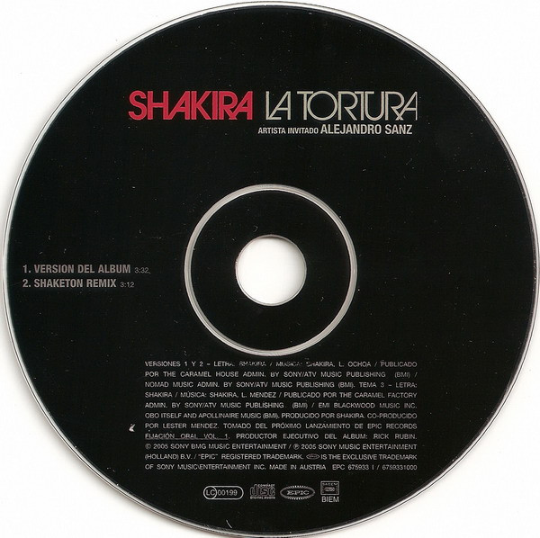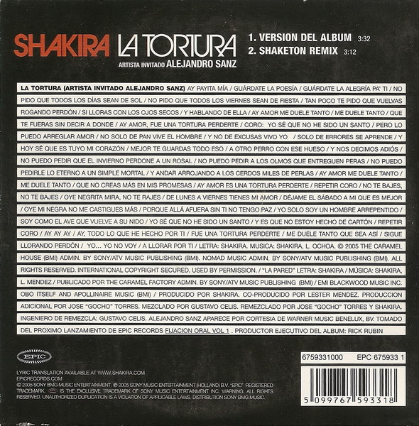 Shakira Artista Invitado Alejandro Sanz – La Tortura (CD, Single, Car)