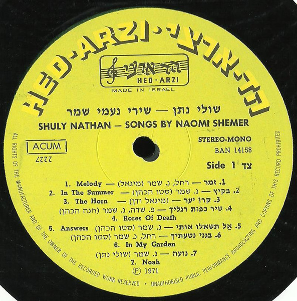 Shuly Nathan = שולי נתן* – Songs By Naomi Shemer = שירי נעמי שמר (LP, Album)