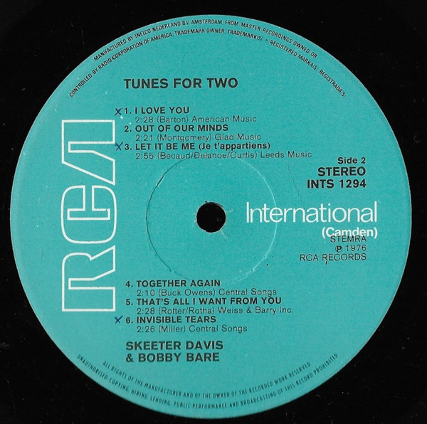 Skeeter Davis & Bobby Bare – Tunes For Two (LP, Album, RE)