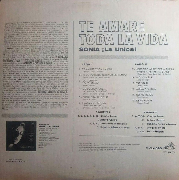 Sonia “La Unica” – Te Amare Toda La Vida (LP, Album, Mono)