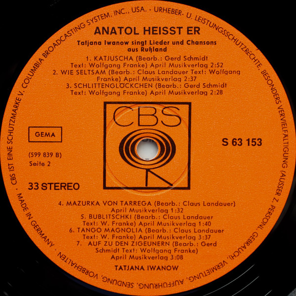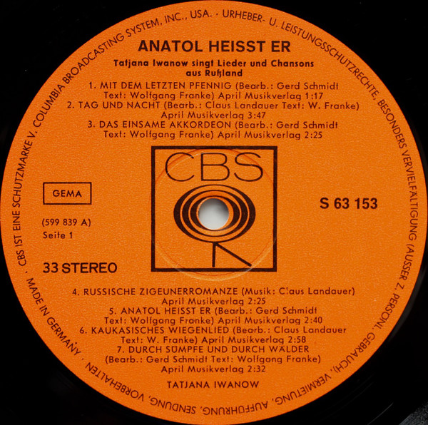 Tatjana Iwanow – Anatol Heißt Er – Tatjana Iwanow Singt Lieder und Chansons Aus Rußland (LP, Album)