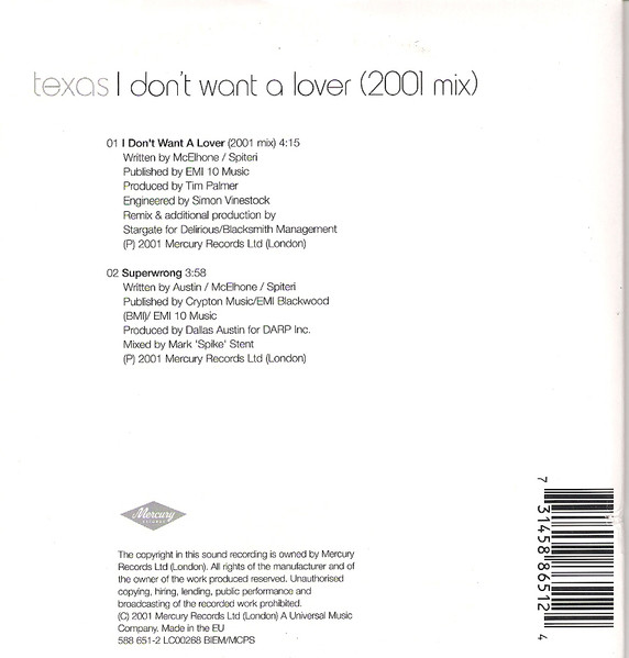 Texas – I Don’t Want A Lover (2001 Mix) (CD, Single)