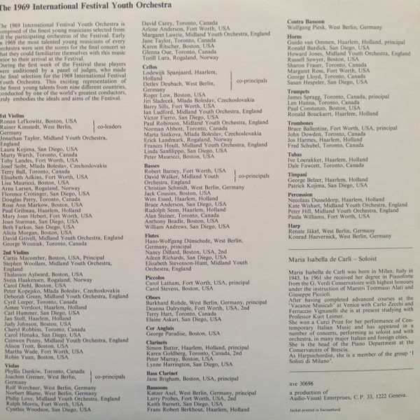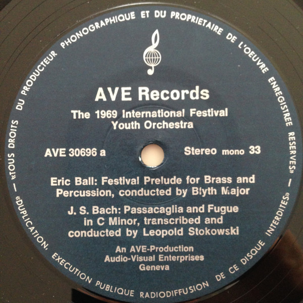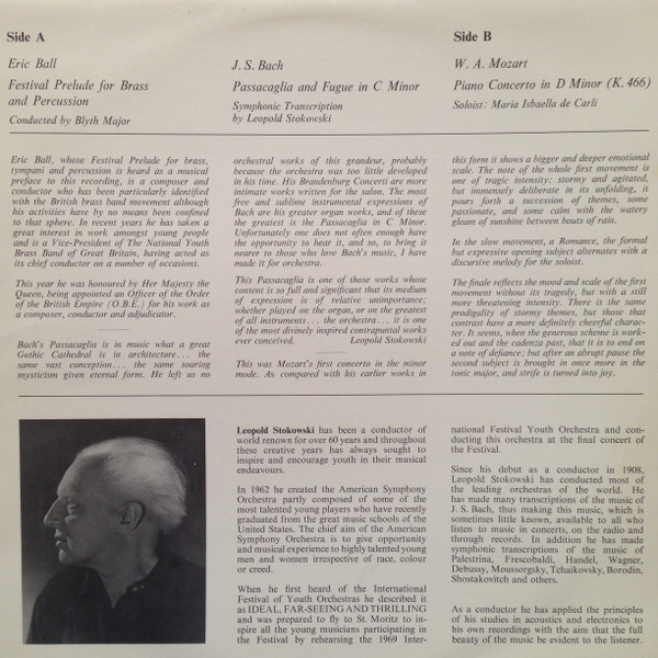 The 1969 International Festival Youth Orchestra, Leopold Stokowski Conducting J. S. Bach* / W. A. Mozart* / Eric Ball – Passacaglia And Fugue In C Minor / Piano Concerto In D Minor (K. 466) / Festival Prelude For Brass And Percussion (LP)