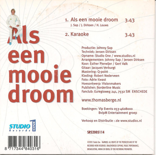 Thomas Berge – Als Een Mooie Droom (CD, Single, Mono)