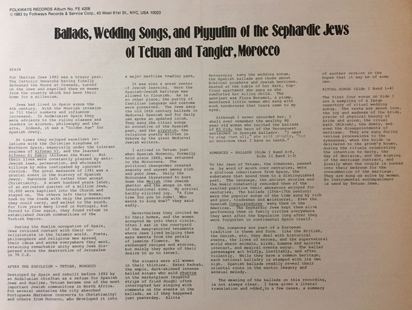 Various – Ballads, Wedding Songs, And Piyyutim Of The Sephardic Jews Of Tetuan And Tangier, Morocco (LP, Album)