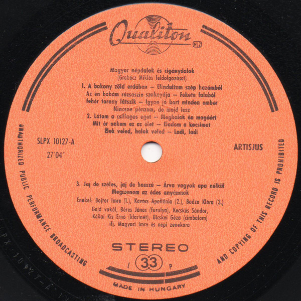 A1. A Bakonyi Zöld Erdőben / Elindultam Szép Hazámból / Az én Babám Rózsaszín Szoknyája / Fekete Faluból Fehér Torony Látszik / Igyon Jó Bort Minden Ember / Nincsen Pénzem, de Majd Lesz