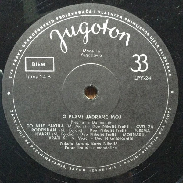 Various – O, Plavi Jadrane Moj (10″, Album, RE)
