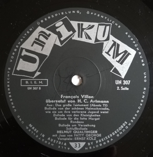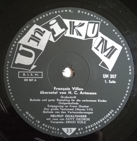 Villon* Übersetzt Von Artmann* Gesprochen Von Qualtinger* Mit Jazz Von Fatty George , Vorspiele: Ernst Kölz – Villon Übersetzt Von Artmann Gesprochen Von Qualtinger Mit Jazz Von Fatty George (Vorspiele: Ernst Kölz) (LP, Album)