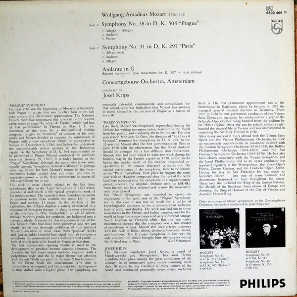 Wolfgang Amadeus Mozart, Concertgebouworkest, Josef Krips – Symphony No. 38, “Prague” / Symphony No.31, “Paris” (LP)