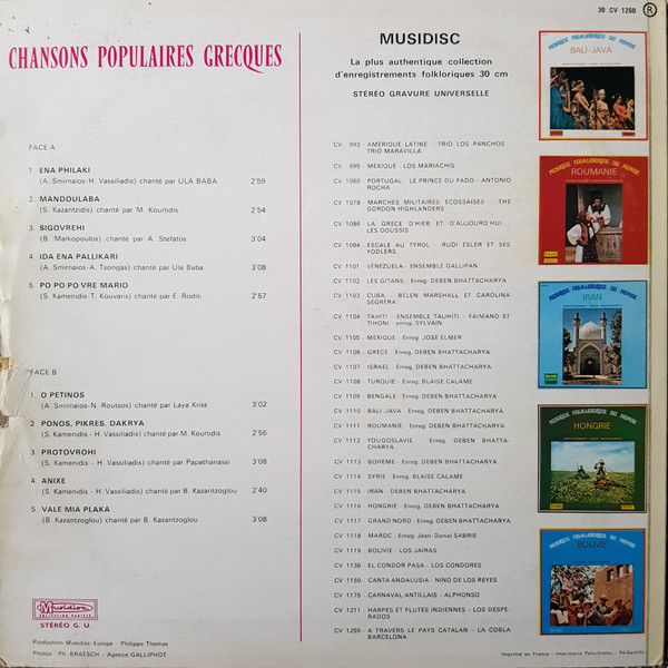 € 5.50 Media: Very Good Plus (VG+)Hoes: Very Good Plus (VG+)Various – Chansons Populaires Grecques (LP, Comp, RE)