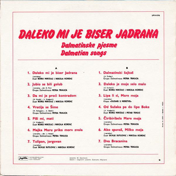 € 4.00 Media: Good Plus (G+)Hoes: Very Good Plus (VG+)Various – Daleko Mi Je Biser Jadrana (LP, Comp, RE, RP)