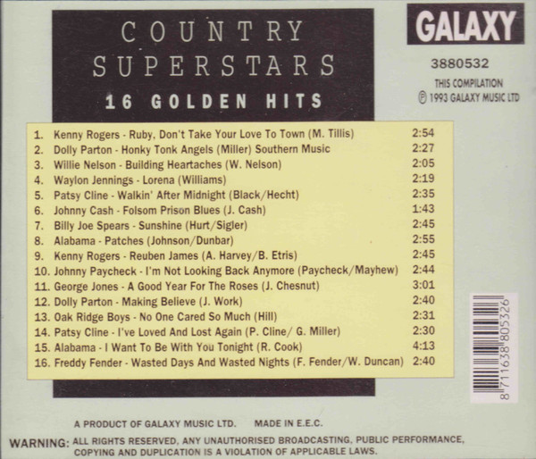 € 7.00 Media: Very Good (VG)Hoes: Very Good Plus (VG+)Various – Country Superstars 16 Golden Hits (CD, Comp)