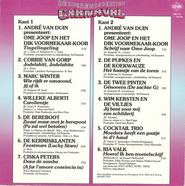 € 7.50 Media: Near Mint (NM or M-)Hoes: Very Good Plus (VG+)Various – De Daverende Dertien Carnaval + 3 Extra (LP, Comp)